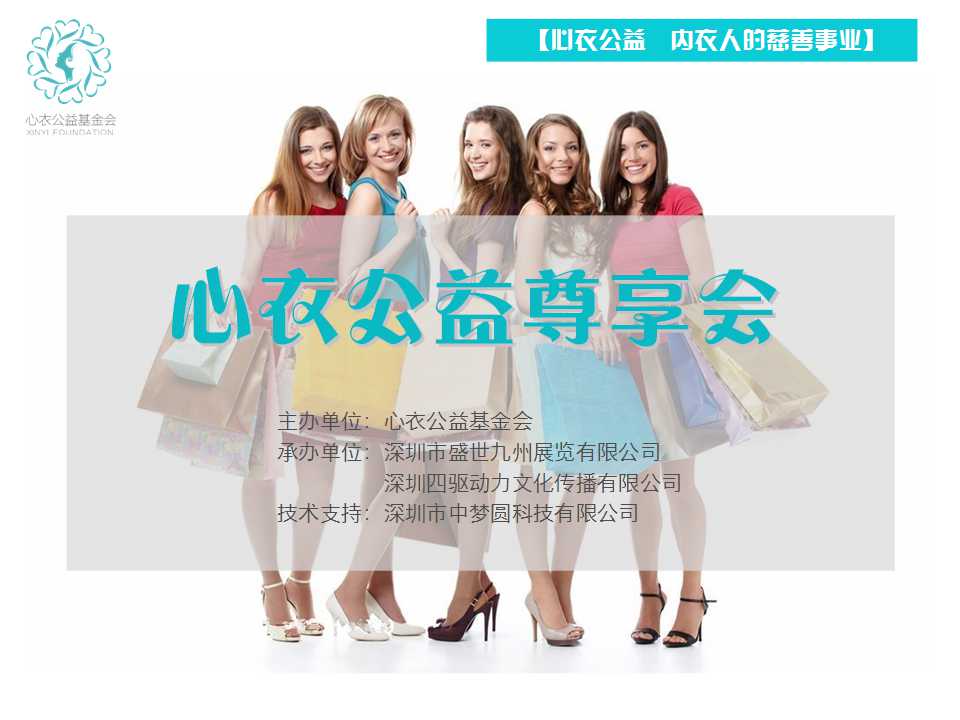 由心衣公益基金会主办、深圳市盛世九州展览有限公司、深圳四驱动力文化传播有限公司承办的“心衣公益尊享会”将携手SIUF2015中国(深圳)国际品牌内衣展,于2015年5月7—9日深圳会展中心6号馆2楼平台举行。此次尊享会旨在通过以低于专柜价的让利优惠形式,通过卖出一件商品向心衣基金会定向捐赠1元爱心的活动方式,弘扬心衣公益基金会的“汇聚内衣行业的力量,推动华夏公益发展的”宗旨,让更多的人关注女性健康,关注公益事业。